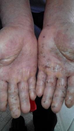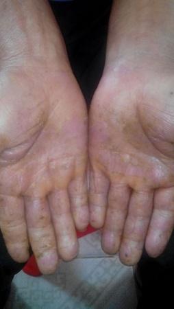 望诊:双手,手掌至肘弯,双手手掌龟裂严重,掌、指肿胀不能握拳,裂缝可见血丝,疼痛。天热掌指干枯无一丝汗出;肘关节至掌,满布疹红点,起白色皮屑,瘙痒。问知有便结。下肢足眼部亦有皮疹。已经严重影响生活,不能工作。