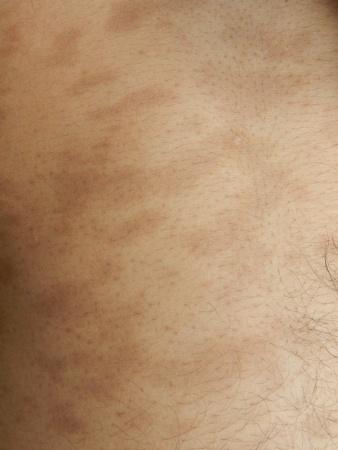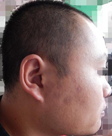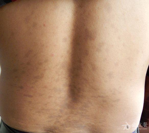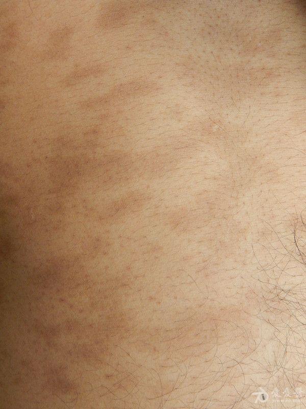 现病史:9个月前,无明显诱因发现右侧面部2块儿黑斑,后躯干部也逐渐出现此黑斑,无脱卸、瘙痒、疼痛,为明确诊断而来诊。