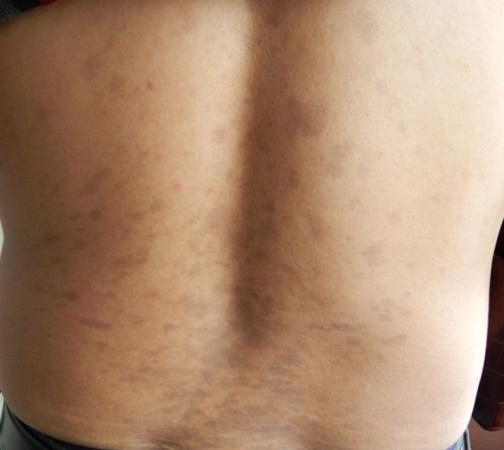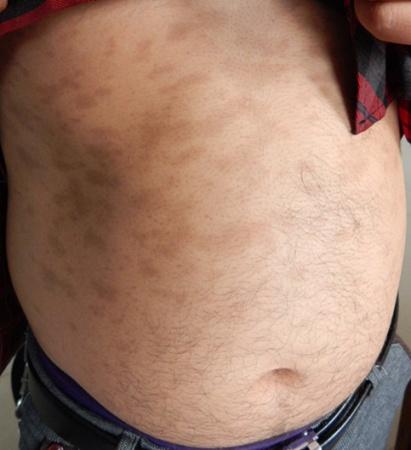 主诉:发现面部及躯干黑斑9个月。