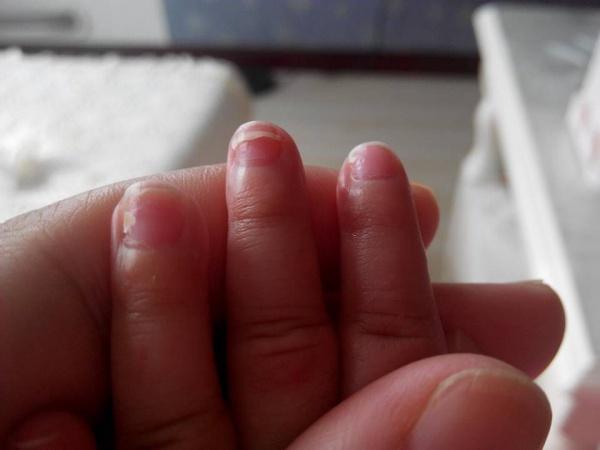 可以考虑脓疱疮,指甲是甲分离症,不知是否患过手足口病。