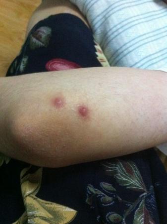14年5月30日,去湖边游玩,环境是杂草丛生,有山有水。。。。。晚上住在帐篷内。第二天回家补充睡眠,晚上,右胳膊肘、左手无名指、双脚小脚趾,右侧脖子出现红包,痒,四五天后透明,扎破后流脓水,结痂后一个月也不痊愈,痂破后继续流脓、结痂,反反复复。痊愈后还会在原地重新长包,反反复复。