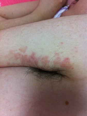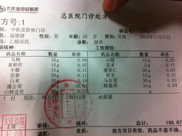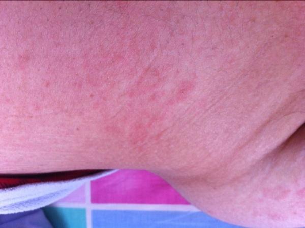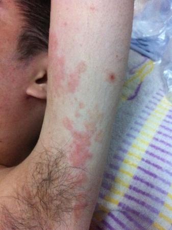 去私营皮肤病医院,诊断手臂为湿疹,胳膊肘是疱疹。开抗过敏药一盒,自制药膏一盒,药实在找不到了。服用后有减轻,手臂几乎完全消失。约10天后复发,两臂大小臂连接处,双大腿、腋下极痒,红,出疹,