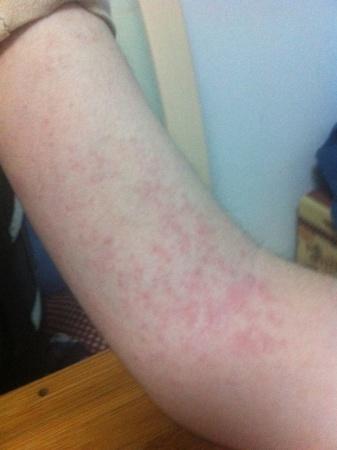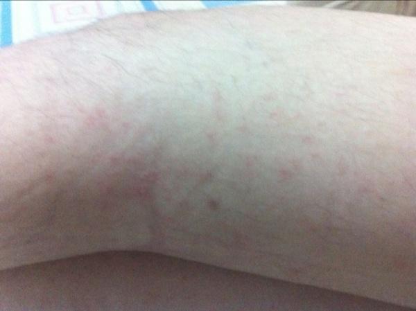 9月中旬,吃了一次鱼,第二天双小臂开始出现红疹,痒,越热越痒,图中白色为皮炎平药膏。