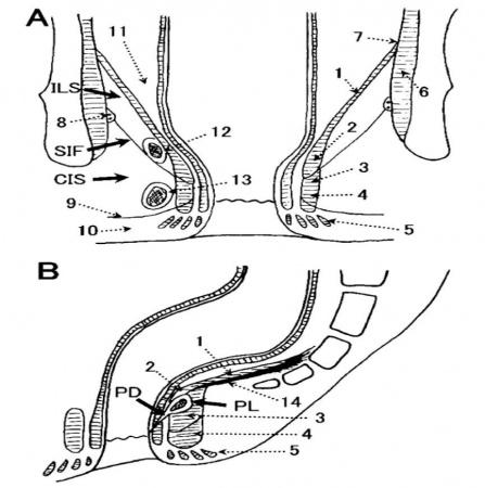 本学说可以补充1纵2隔学说的不足,1纵2隔学说解决的是从哪里来,本学说解决的是到哪里去。尤其对肛直环广泛硬化没有外口的高位肌间瘘的手术治疗有着非常重要的指导意义。从本理论看,脓液在高位括约肌间隙不向肛外蔓延,而是向上蔓延,就进入肛管后深间隙或/和两侧的坐骨直肠窝内上方的提肌下间隙,炎症对耻骨直肠肌和肛提肌、外括约肌深部造成广泛的炎性浸润,形成肛直环硬化,临床可见一侧或两侧的坐骨直肠窝处压痛明显,而切开始找不到脓液,从6点切开进入高位括约肌间隙后,感觉向上很深、很高,很像进入了骨盆直肠间隙,如果是脓肿,放出的脓液很多,从脓液量上判断也很像进入了骨盆直肠间隙。