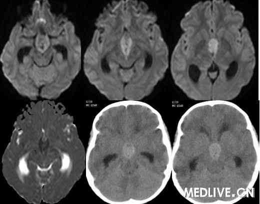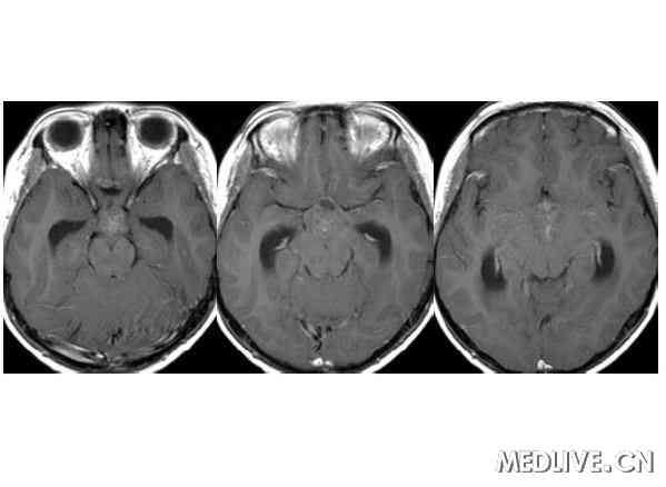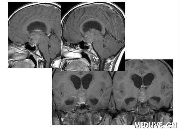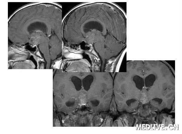 解答详情: 生殖细胞瘤由原始的生殖细胞衍生而来,好发于松果体区,其次为鞍上池。肿瘤多发生于男性青少年,位于鞍上生殖细胞瘤则以女性多见。生殖细胞瘤对放射线非常敏感。该瘤通常无包膜、无钙化、出血、坏死或囊性变,属低度恶性肿瘤,多呈浸润性生长,常有不同程度和形式的转移,易向蛛网膜下腔及脑室系统种植、播散。组织学上,肿瘤主要含有两种细胞成分:上皮样细胞和淋巴样细胞。 1、CT表现: ①肿瘤最常见于松果体区,位于鞍上区肿块常累及漏斗; ②CT平扫多呈等密度或稍高密度肿块,无出血、坏死及囊性变,可分叶,但境界清楚;瘤体本身钙化少见,典型松果体区生殖细胞瘤常见肿瘤包埋松果体钙化灶。 ③增强扫描呈中等至明显的均匀强化。 ④室管膜下转移可表现为沿脑室壁线状或条片状强化,沿脑脊液向蛛网膜下腔播散表现为脑表面、脑池的线状或结节状强化。 2、MR表现: ①最常见于松果体区,也常见于鞍上,可同时或单独存在。②T1加权为略低信号或等信号,T2加权常呈等信号或高信号。③增强后;呈明显均匀一致强化,并能发现沿脑脊液或室管膜转移的病灶。鉴别诊断 1、颅咽管瘤:多为囊性或囊实性肿块,钙化多见。纯实性者可呈稍高密度,并可强化,与生殖细胞瘤不易鉴别、 2、星形细胞瘤:一般肿瘤较大,密度偏低,后期可出血,肿瘤通常位于下丘脑,并沿视交叉或视束延伸,可在眼眶内形成肿块。 3、垂体瘤:发生于鞍内,但可向鞍上生长,小儿罕见,肿瘤易出血、坏死,鞍底骨质变薄、下陷,海绵窦常受累。 生殖细胞瘤。4、脑膜瘤:好发于成人,儿童罕见,肿瘤部位偏前,伴骨质增生、硬化及蝶窦过度气化。