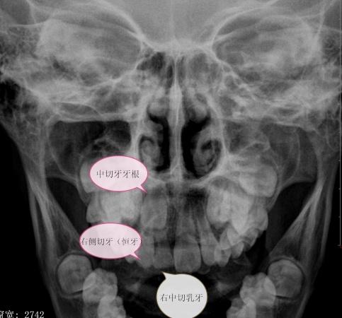 9岁10个月,右侧中切牙乳牙未换,右侧切牙已换