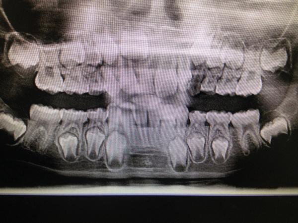 首先拔除乳中切牙,加强咀嚼,2、3个月后重新拍片观察情况。