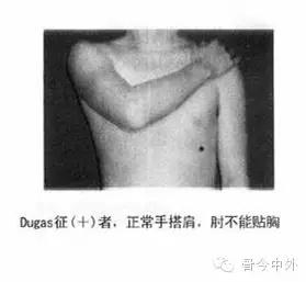 在正常情况下将手搭到对侧肩部,肘部可以贴近胸膛,称为杜加氏(Dugas)征阴性,肩关节脱位时,患侧肘贴胸,其手掌不能搭到健侧肩部,或患手搭于健侧肩时,肘不能贴胸壁,称为杜加氏(Dugas)征阳性。