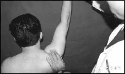即惧痛试验。患者放在外展外旋(投掷)位,医生推肱骨头向前与前关节囊相压撞,后者有病变时剧痛,突感无力,不能活动,提示肩关节前方不稳。