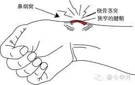 即握拳尺偏试验。使患者手先屈拇指对掌并握拳,检查者将患者已握拳的手向尺侧倾斜,若桡骨茎突处出现剧痛,是为阳性,表示患有桡骨茎突部狭窄性腱鞘炎。