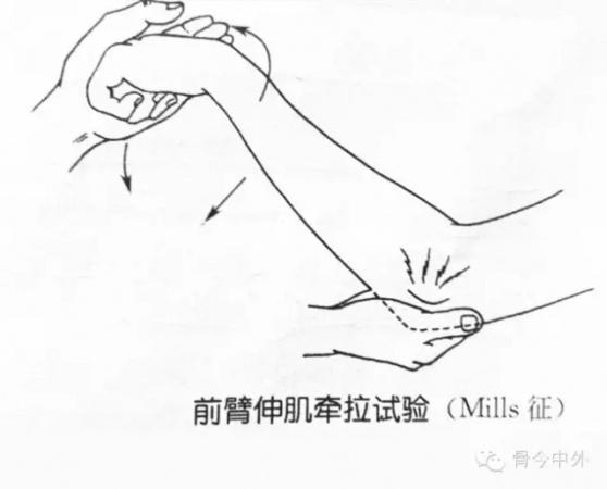 即前臂伸肌牵拉试验。肘关节伸直,前臂旋前,手握拳掌屈,此时伸腕肌,伸指总肌紧张,若引起肱骨外上髁处疼痛者为阳性,表示患有网球肘。