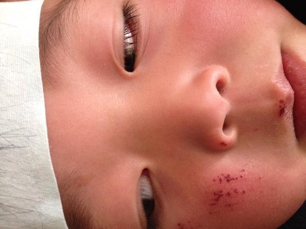 查:体温:39.9.(肛温)。脉搏:130次/分。呼吸:28次/分。血压:78/52mmhg.体重:18kg.神清,精神可,发育正常、营养好,呼吸促,皮肤无黄染,未见皮疹、无渗出及溃疡,浅表淋巴结无肿大,发热貌,两结膜红肿充血明显,有的脓性分泌物,两侧结膜有滤泡、球结膜有少许出血点,口唇红,口腔粘膜较光滑,咽红充血,扁桃腺无肿大、表面无脓性分泌物,颈软无抵抗,胸两侧对称,两肺呼吸音粗,未闻及干湿性啰音,心律:130次/分,律齐,各瓣膜区未闻及杂音,腹软,无压痛及反跳痛,肠鸣音7-9次/分,双肾无叩击痛,**无脱皮,四肢检查(-),神经系统检查(—)。