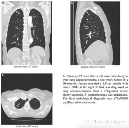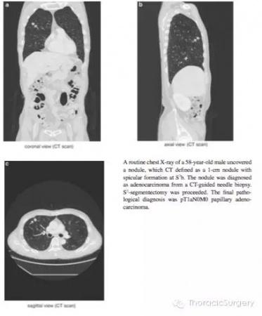 患者,男性,58岁,常规胸片发现右上肺结节。CT可见一S3b的1cm结节,周围伴有毛刺。CT定位下活检病理证实为肺腺癌。予以S3肺段切除。最终的病理学诊断为pT1aN0M0**状腺癌。