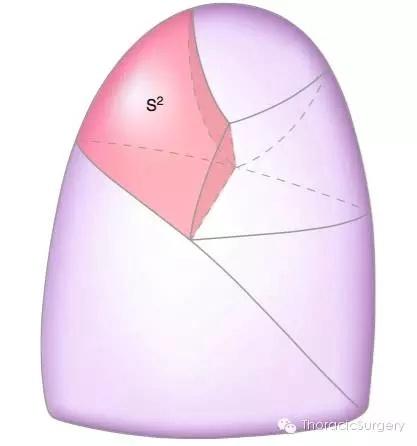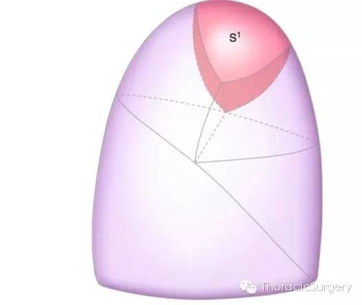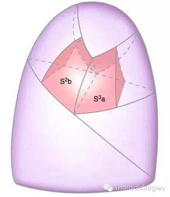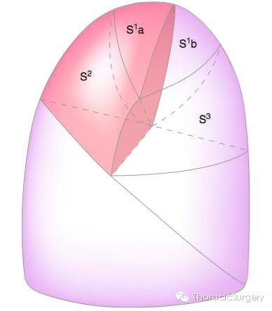 图.3.1.6 此时,B1后可见V2a,V2a走形于S1和S2间。肺组织沿V1b和V2a和通胀萎缩线切割。原则上,如果手术切缘足够,保留V1b和V2a分别保留于S3和S2上,有助于引导段间平面和保持静脉血流。从各个方向切割段间平面,方便简单,精确切割。