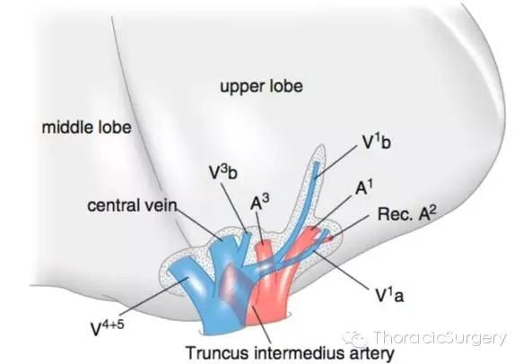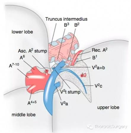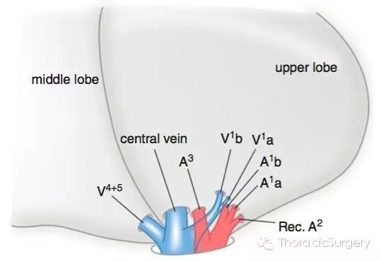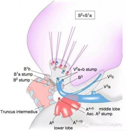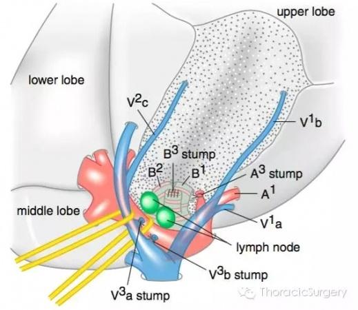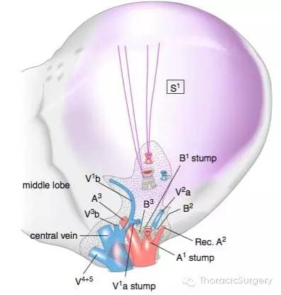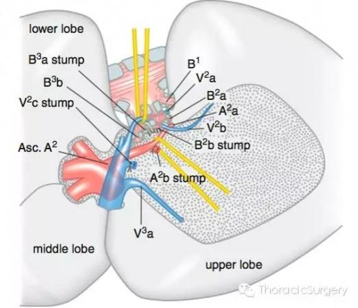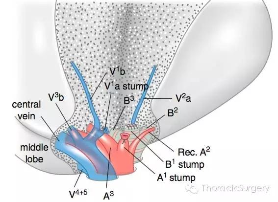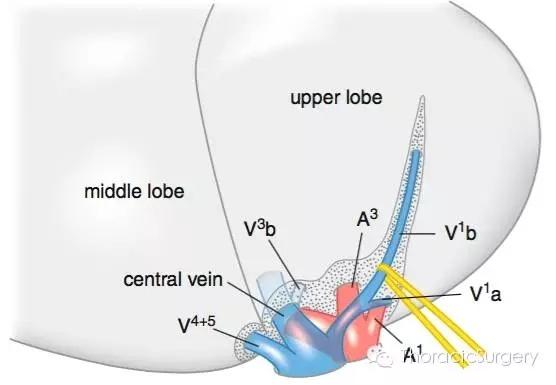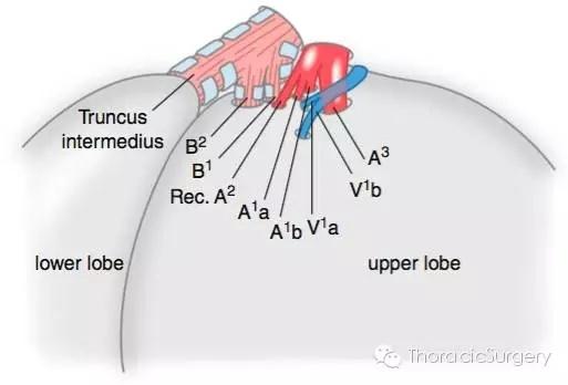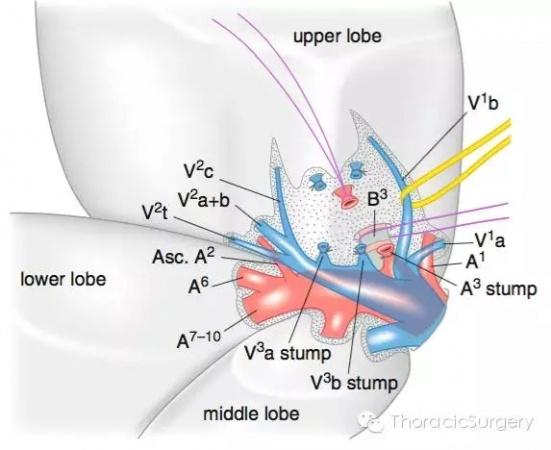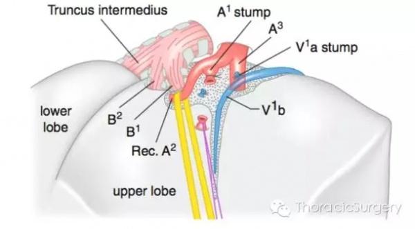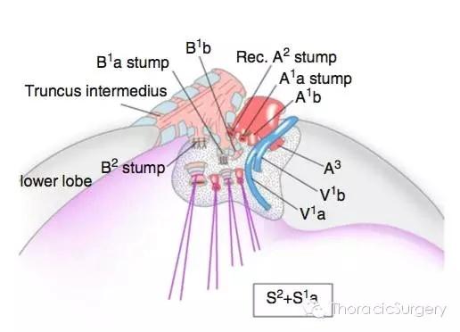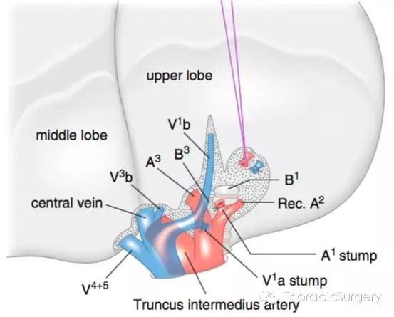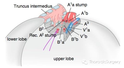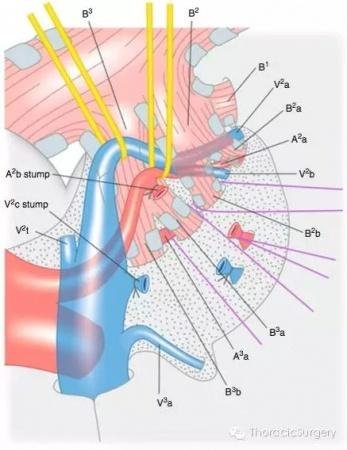 图.3.3.2 从腹侧向背侧暴露上叶肺门以显示上肺静脉,肺动脉上干分支,上叶支气管,以及上叶支气管和中间支气管干之间的分叉。暴露上叶支气管的背侧外周,便于识别B1,B2和B3。胶带牵拉V1并向外周暴露,以确定V1a和V1B。V1B是S1和S3之间的段间静脉,邻近肺表面并向肺尖走行。暴露V1B的外周。然而,V3C(位于S3bi和S3bii之间)有时在近端V1形成分支,走行与V1B相似,V3C沿腹侧走形并深入肺实质而V1B邻近肺表面并向肺尖走行,这有助于术中区分两者。识别V1B使得术中易于辨别A1和A3,相对于V1B前者走行于背侧和后者走行于腹侧。但是,根据肺牵引的方向该位置关系通常会发生变化,即相对于V1B,A1有时向腹侧和A3有时向背侧走行。因此,应仔细确认A1和A3,即使已明确V1B的情况下亦应谨慎辨别。为了准确地识别它们,区分A3的后动脉分支并予以保留,这可能是A1分支。离断B3后,A1和A3分支便于识别,A3分支向B3的远侧残端走行,而A1分支远离其走行。