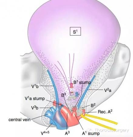 图.3.1.2从腹侧向背侧暴露右上叶肺门以显示肺静脉,肺动脉上干,上叶支气管和上叶支气管和中间支气管间的分叉。如果可能的话,暴露上叶支气管的背侧直至B1和B2分叉,这有利于以后识别A2反支。胶带牵拉V1并暴露外周以明确V1a和V1b。V1b走行于肺表明附近并向肺尖走形。如果V3c(S3bi和S3bii间静脉)由V1b中心发出,应与V1b相鉴别。然而,V1b于肺表面走向肺尖,V3c走向腹侧并深入肺实质。显露V1b外周。 切断V1a(S1a和S1b间静脉)。曝露V1b后明确A1和A3,分别从背侧和腹侧走形至V1b。