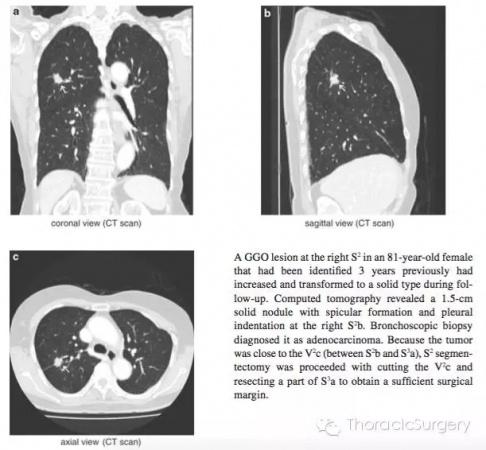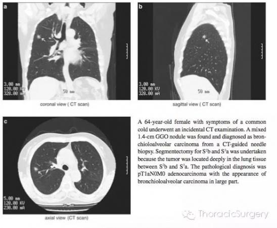 患者,女性,64岁,因反复出现感冒症状,CT检查发现右上肺1.4cm的GGO。CT引导下的穿刺活检病理证实为细支气管肺泡癌。由于肿瘤位于肺组织深部,予以S2b + S3a肺段切除。最终的病理学诊断为pT1aN0M0细支气管肺泡癌。