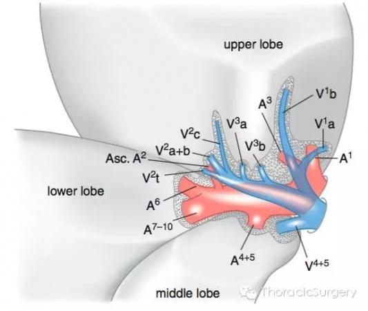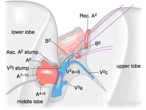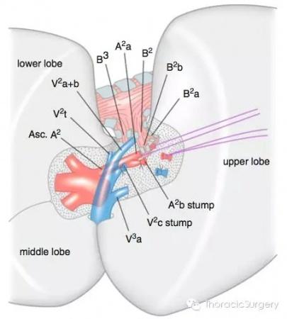 图.3.5.2 电刀分离右上叶和下叶之间肺裂但不要使用切割缝合器,因为钉线会影响术中对V2外周段的识别,以及可能会导致段间平面的识别变的复杂。暴露中央静脉后,识别V2c(位于S3a和S3b之间)和V3a(位于S2b和S3a之间)。 V2c分支经常与V2a+b相伴行,在这个手术视野中前者位于前面,后者走行于后面。此后,V2c沿上叶的侧面向上走行,临近于肺表面。V3a有时被误为V2c,可以通过以下方法予以区别:(1)V2c分支位于肺裂的后侧,并与V2a+b相伴行;(2)V3a分支常位于肺裂中央并几乎垂直于中心静脉。切断V2c后,暴露V2a+b的外侧段。在该手术视野中,B2走行于V2a+b前面,而B3走行其后。暴露A2升支,识别A2b并予以离断。离断A2b后暴***2。暴***2外周后,可识别B2a和B2b。 B2b予以套线牵拉。