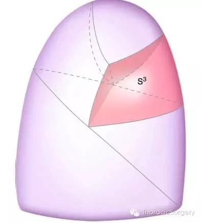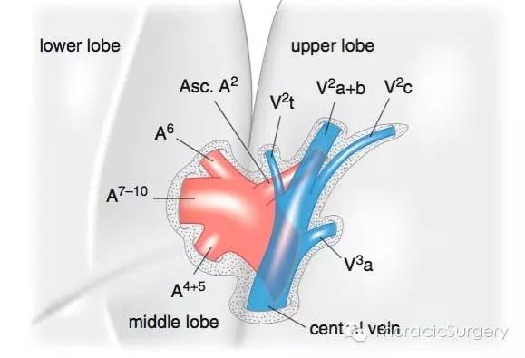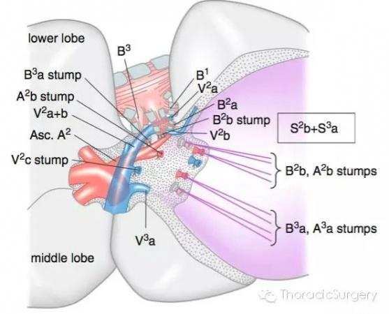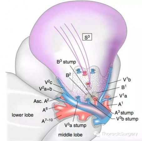 图.3.3.3 S3-段切除时右上叶和中叶之间的肺裂常融合在一起,使用电刀予以分离。不要使用切割缝合器,因为切割缝合器可导致S2 和 S3的平面难以鉴别。将支气管镜插入B3后进行喷射通气,膨胀的S3和萎谢的中叶间形成膨胀萎谢线。使用电刀沿该膨胀萎谢线进行切割。打开肺裂后可见中央静脉,并向外周暴露,反过来又可暴露V3B,V3A和V2c。有时,V3A和V2c难以区分,通过以下几点可以区分:(1)V2c往往于肺裂的背侧分出,V3A分支位于其中心部分;(2)V2c形成分支后常与V2A+B相伴行;(3)V3A分支常垂直发出于中央静脉。胶带牵拉V2c并暴露外周,定义S2和S3之间的段间平面。明确这些血管分支后,切断A3,V3A,V3B和V3C。
