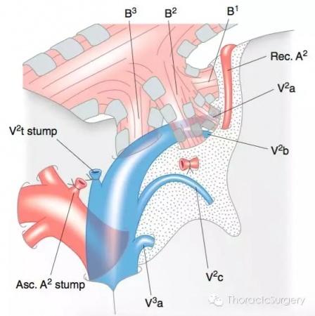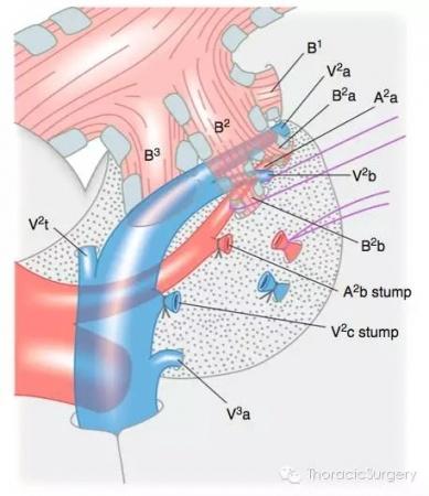 图.3.5.3 该图是B2周围结构的放大图。 V2a+b走行于B2背面。V2b分支位于B2的背面,并走行于B2a和B2b之间。A2a升支走行于B2背面,并向B2a走行。