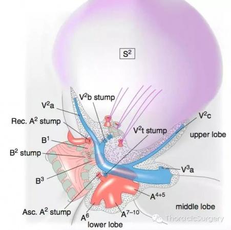 图.3.5.6 V2b和V3a沿段间平面予以保留。通过牵拉上叶支气管,V2,A2升支和上肺动脉干淋巴肺门结清扫,方式与S2或S3-肺段切除淋巴的淋巴结清扫一样。