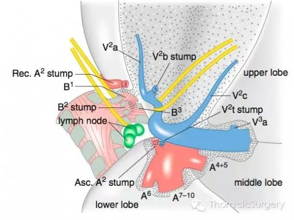 图.3.2.4 切断 A2后升支后暴***2。在该手术视野中B2走形于V2a + b前,而B3 走形于V2a + b后,这有助于暴***2 和 B3。此外,从上面暴露右上叶支气管外周,充分暴***1 和 B2。胶带牵拉B2。这时A2后升支和A1a通常难以区分,但这并不重要,因为切断 B2或建力膨胀萎谢线后通常容易鉴别。A2后升支通常向B2的远端残端走形,而A1分支的走向是远离B2的远端残端。术中支气管镜有助于识别B1, B2和B3。