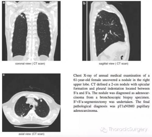 患者,女性,61岁,体检发现右上肺结节。CT可见S1a和S2a间2cm结节,周围伴有毛刺和胸膜凹陷。支气管镜活病理证实为肺腺癌。予以S2 + S1a肺段切除。最终的病理学诊断为pT1aN0M0**状腺癌。