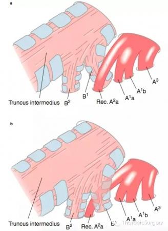 图.3.4.4 A2返支的走形有两种模式:常见的A2返支走行于B1的背侧,然后与B2伴行(a);另一种是沿着B1腹侧走形,随后与B2伴行(b)。前者比后者更常见,本文以前者为例。