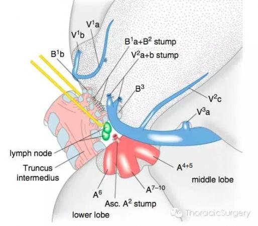 图.3.1.4 切断A1后,分离B1前淋巴结以暴***1。由于V2a走行于B1后,牵引带牵引B1以免损伤V2a。当B1不能明确时,支气管镜有助于明确B1,B2和B3。