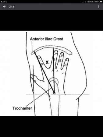 a 以食指尖和中指尖分别置于骼前上棘和髂嵴下缘处,在髂嵴、食指、中指之间构成一个三角形区域。注射部位在食指和中指构成的角内。