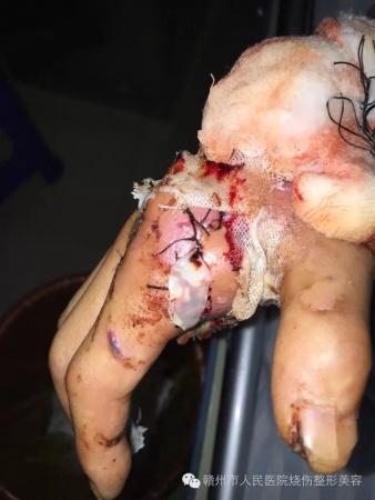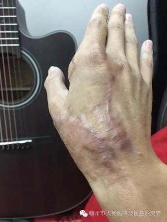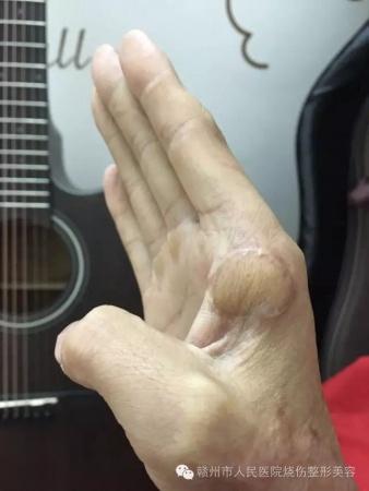 赣州市人民医院烧伤整形科,在电烧伤治疗方面积累了丰富的临床经验,我们总结出虎口电损伤的修复原则:应尽早清除坏死组织,创面以皮瓣或皮瓣与游离植皮联合应用I期修复,可避免伤口感染;保留残留拇内收肌功能,避免指神经继发性坏死,最大限度保留拇指功能。术中切口应沿皮纹方向延伸,清创及止血彻底,皮瓣下置负压引流管充分引流,术后用石膏将拇指固定于虎口开大的功能位,都可以从一定程度上减少虎口挛缩的发生率,改善虎口修复后的远期疗效。