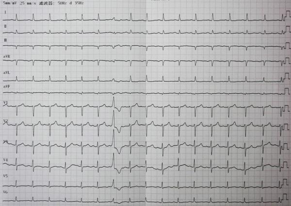 患者 女,48岁,脑梗入院,宽大畸形QRS波前有P波,而且规律出现,未见明显提前。QRS波略提前一点儿出现,其前后P-QRS-T波均大致相同规律出现。此病人观察几分钟仅出现一次这种情况。