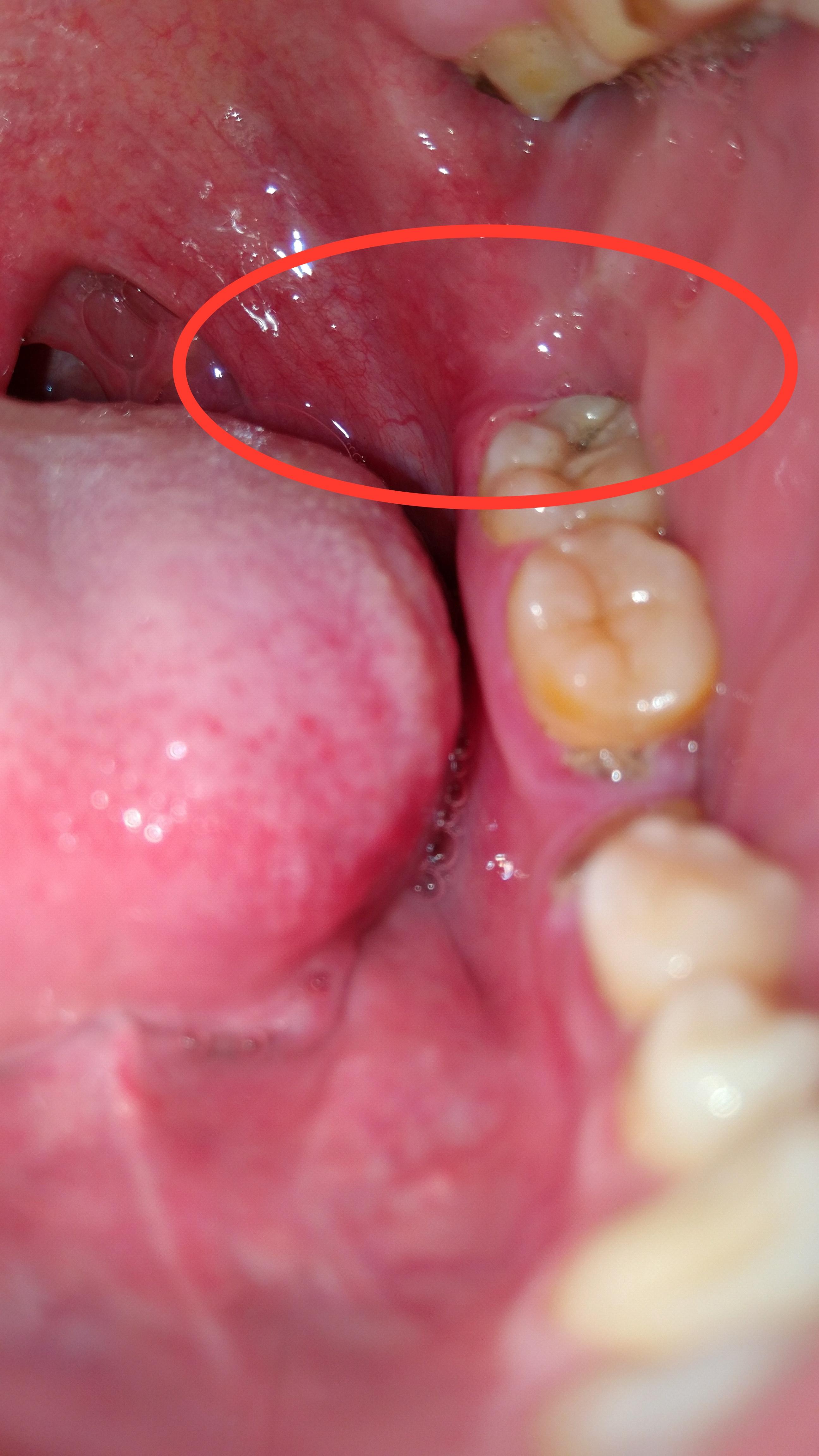 最开始左边牙齿最里面的那一颗有些不舒服,而后牙齿周边发疼,现在最里面的肉都非常疼,动嘴就疼。用药酒点了一下,更疼,舌头舔到好像起褶起