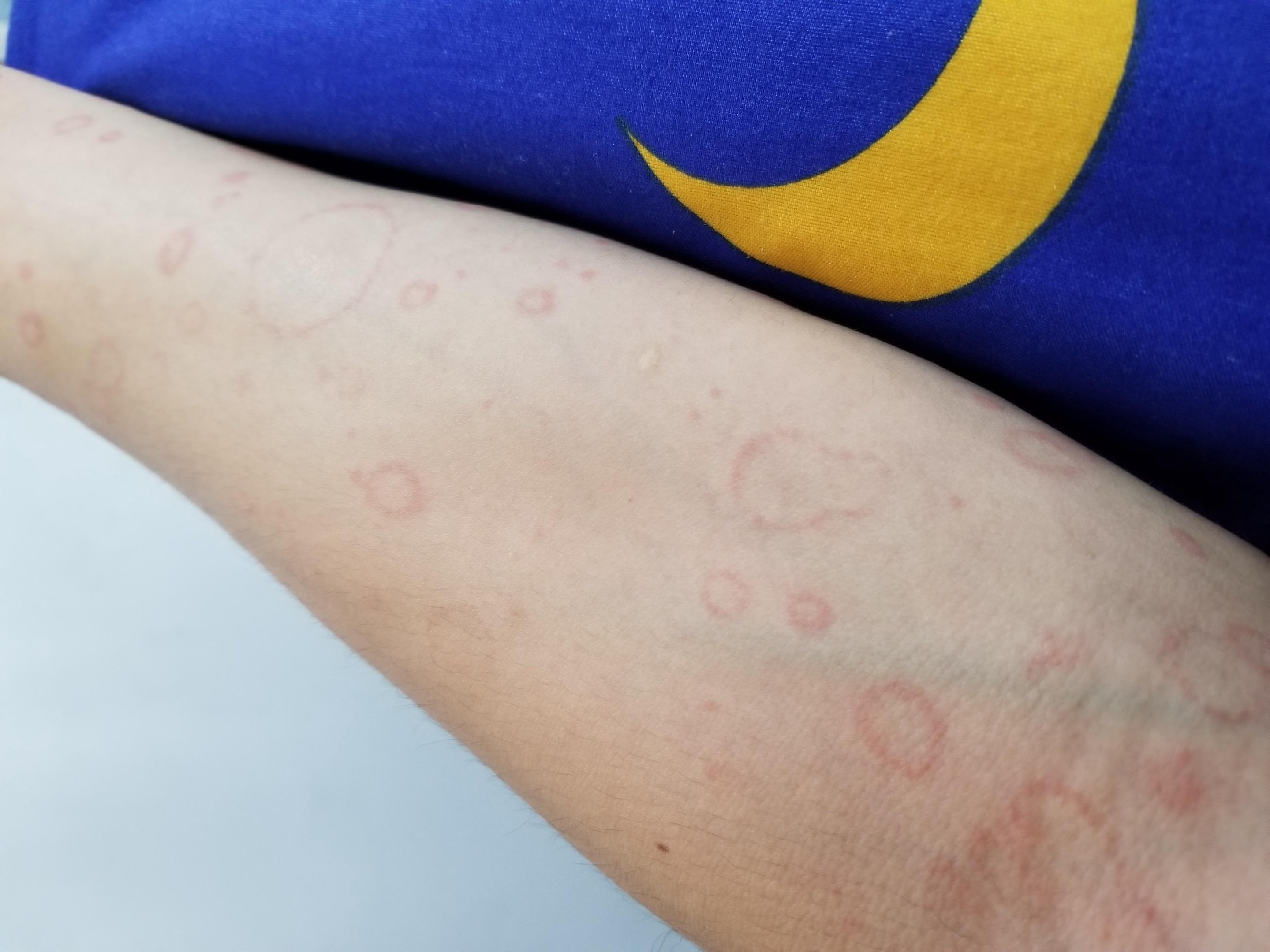 2周前左手臂长了一颗红斑,几天后红斑逐渐扩大,形成中间空心的环状红斑,在过几日全身都出现同样的红斑并圆圈逐渐扩大。全身不痒,无其他症状