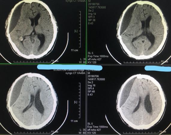 我们欣喜地发现,中线较前回位,血肿质地较前均匀,再加接近常见的慢性硬膜下血肿的密度了。血肿厚度减小为2.5cm.