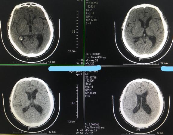 我们有了底气,继续令患者右侧卧位,立普妥口服,大量补液,十天后,也就是今天,我们再次复查头颅CT如下: