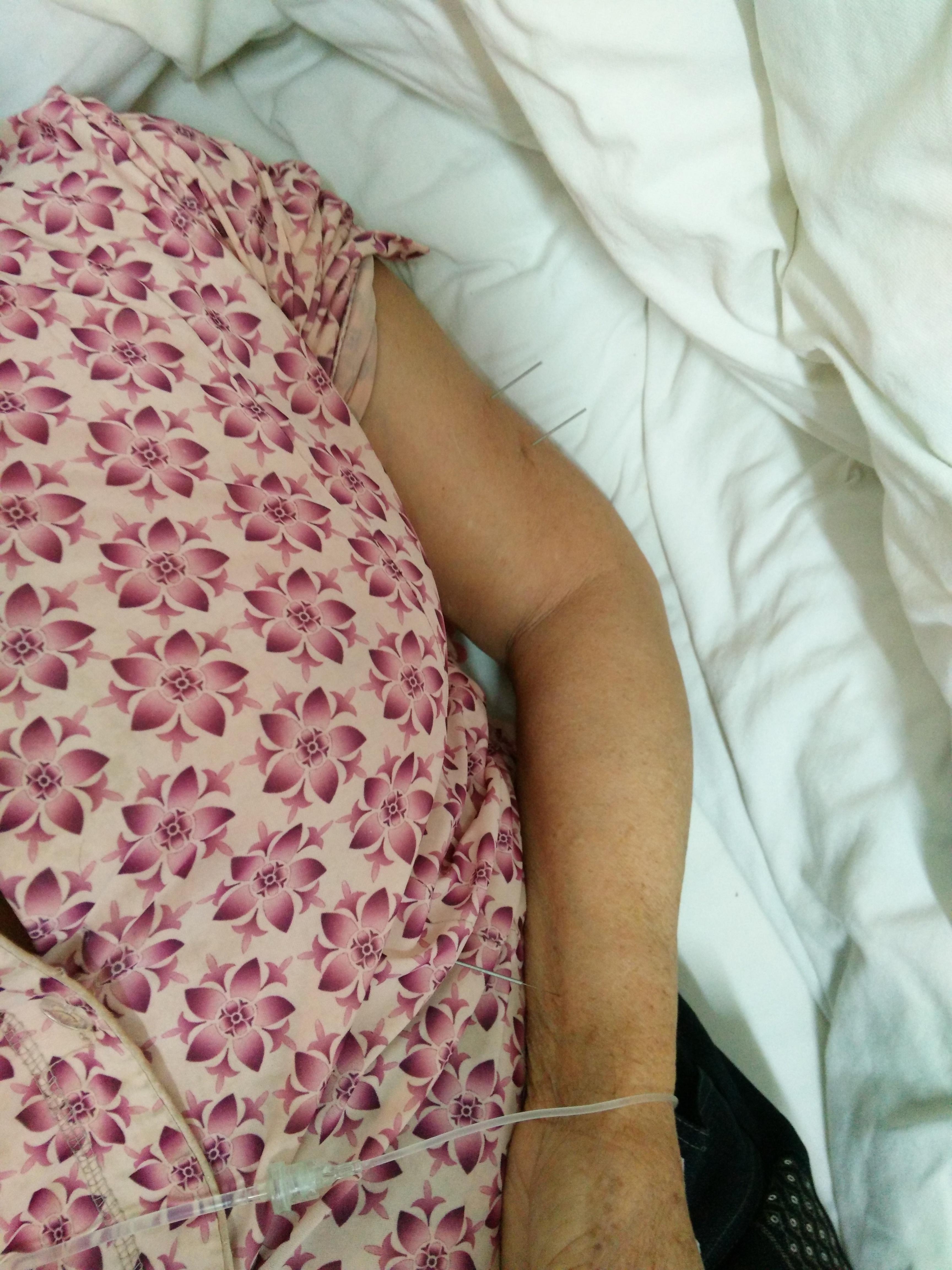 患者梁某,女,67岁,右上肢节律规则抽动约1天,每分钟60次,以肱二头肌和胸大肌规律抽动,于昨天晚上曾停止过两次约2小时。神志清楚,精神可,有蛛网膜下腔出血病史和脑出血病史,高血压病史。针百会、率谷透百会(左)、天府(左)、侠白(左)、内关(左)、阳陵泉(左),留针60分钟,针时间段停止抽动,于30分钟时完全停止抽动。