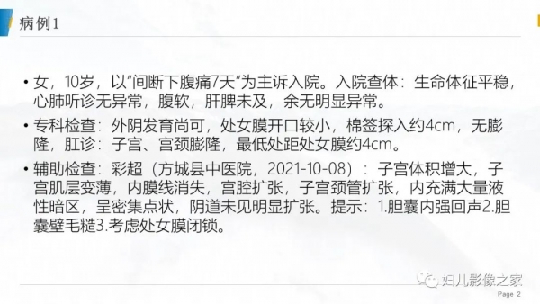 辅助检查:彩超(县中医院,2021-10-08):子宫体积增大,子 宫肌层变薄,内膜线消失,宫腔扩张,子宫颈管扩张,内充满大量液 性暗区,呈密集点状,阴道未见明显扩张。提示:1.胆囊内强回声2.胆 囊壁毛糙3.考虑处女膜闭锁。