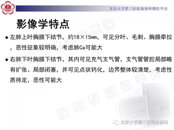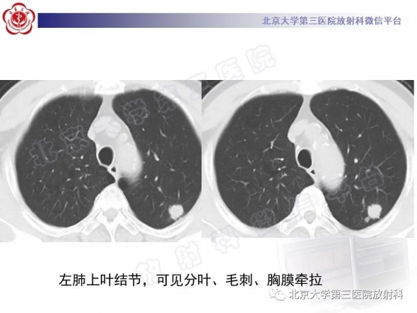半月前外院体检胸片示左肺上叶结节,进一步胸部CT检查发现左肺上叶尖后段胸膜下结节,约1.8X1.6cm,边缘可见分叶、毛刺,右肺下叶基底段胸膜下小团状密度增高影。