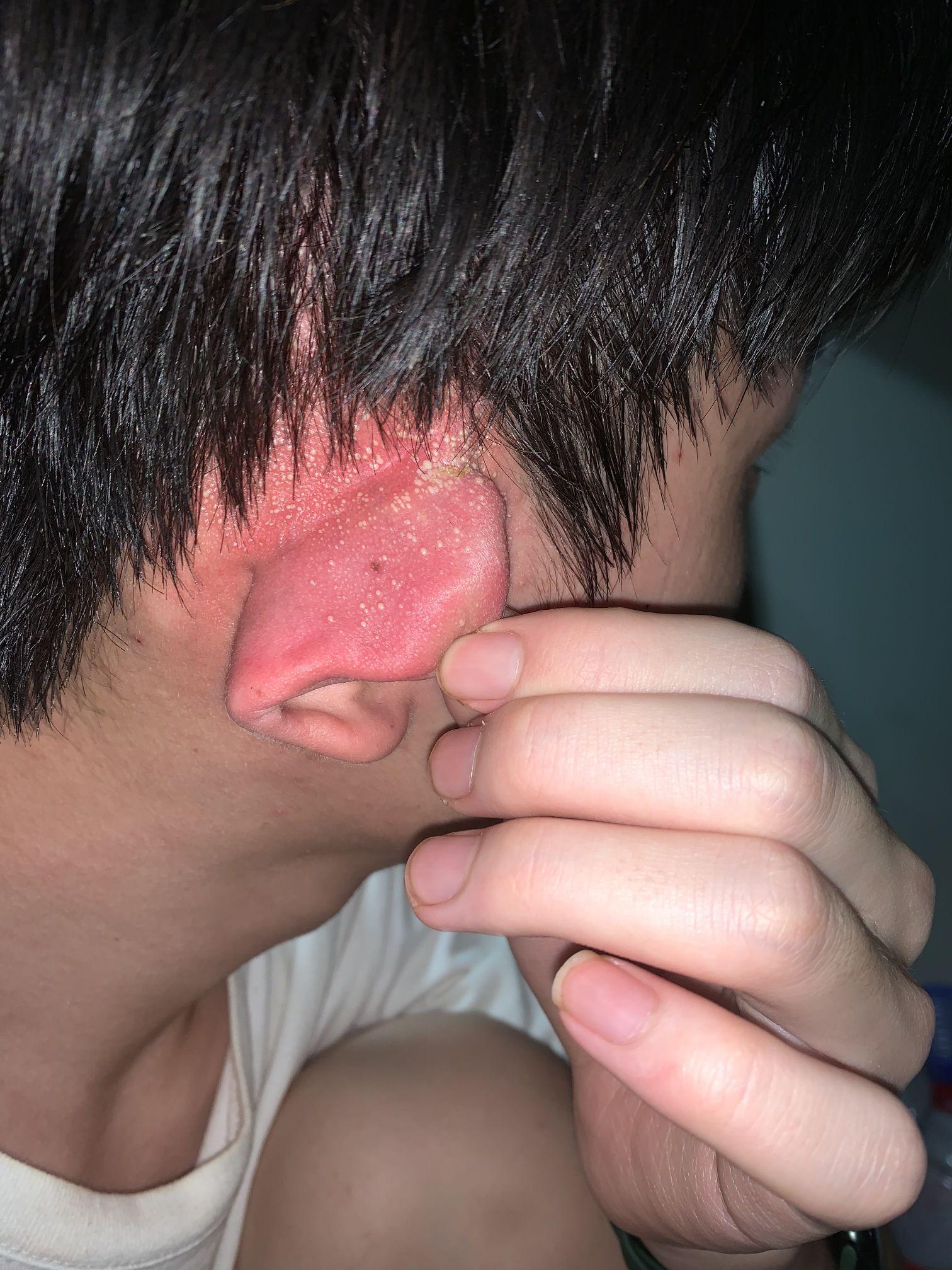 右耳朵和头皮有好多密密麻麻的像化脓一样的泡,而且也有全身发烧两天,高38.5,过往体健有单纯疱疹病史 。水平不痛不痒,不摸就不会痛,摸会刺痛。好像是一晚上发出来的。