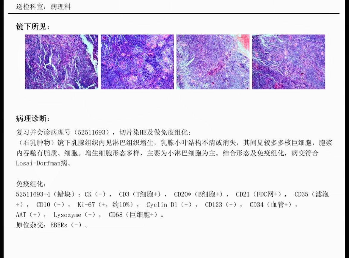 窦组织细胞增生伴巨大淋巴结病(Rosai-Dorfman病)是病因不明的局部或系统性淋巴结病或结外病变。预后极佳,常在3-9个月后自发消退。但通常需要到血液科综合评估,是否存在系统性受累。少数患者,也是需要考虑化疗或者靶向治疗。