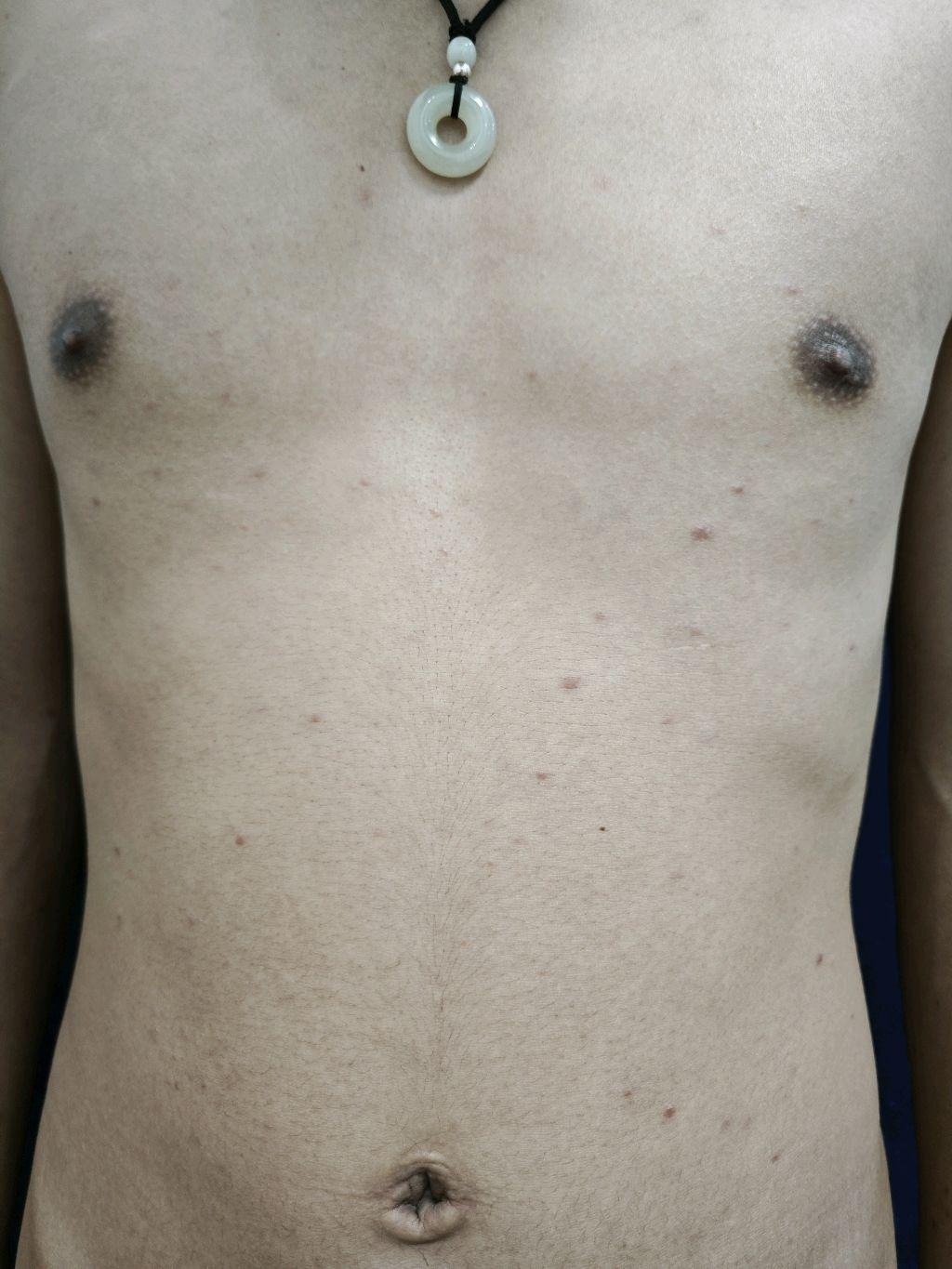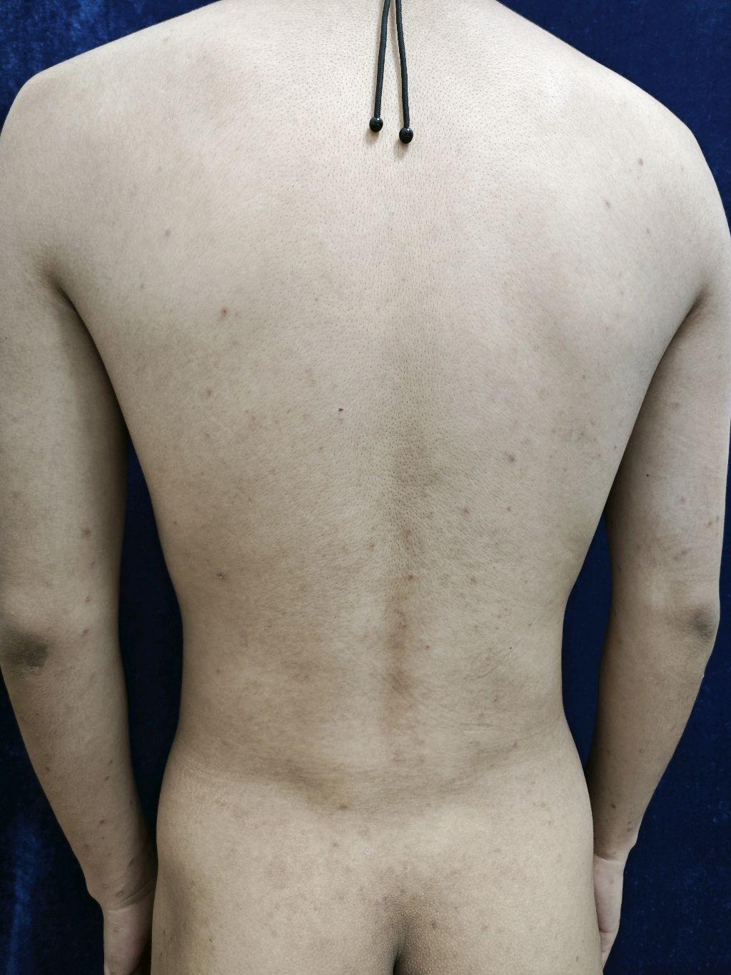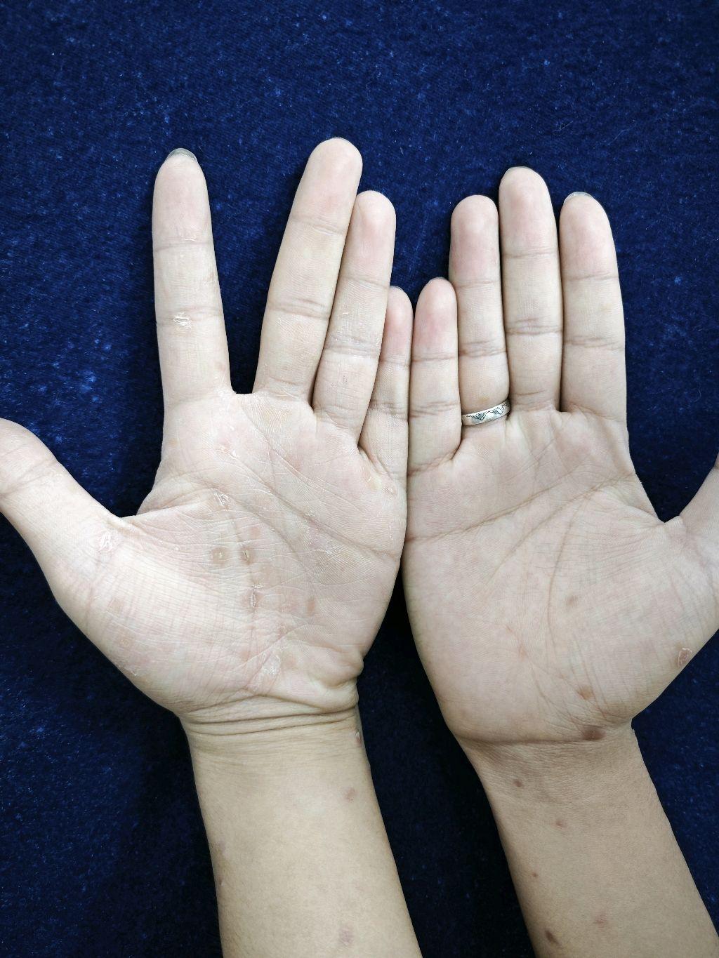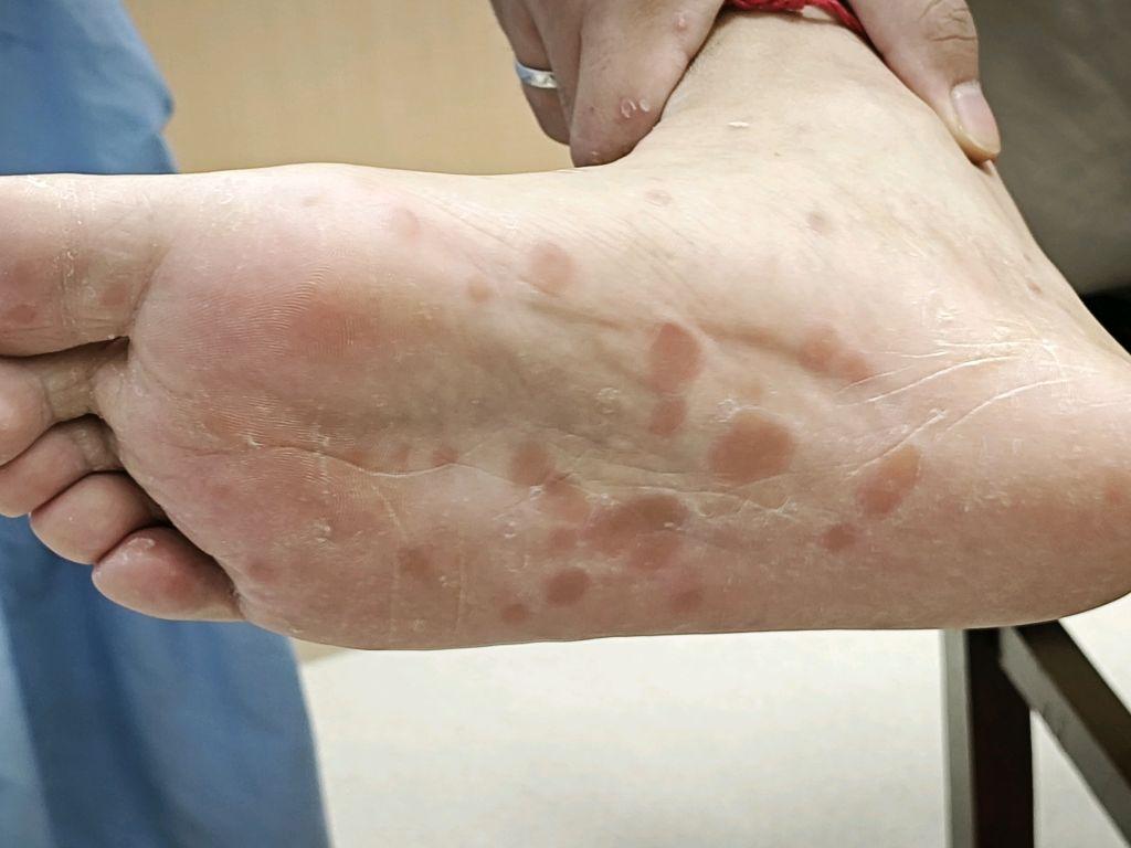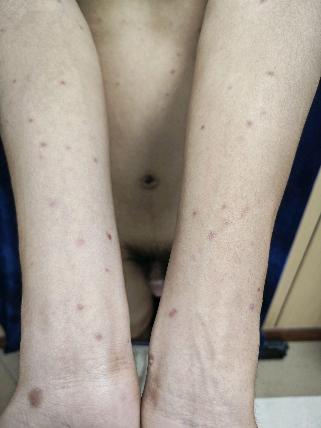 患者青年男性,全身红斑1月余就诊,无明显瘙痒,无其他不是,有高危性行为史。查体:躯干、四肢大量散在的淡红色斑疹,部分表面见鳞屑。手掌及足底见鲜红色斑疹,皮疹较躯干更红更大,表面形成鳞屑附着,边界清除。辅查梅毒螺旋体抗体阳性,梅毒滴度1:128。确诊二期梅毒。