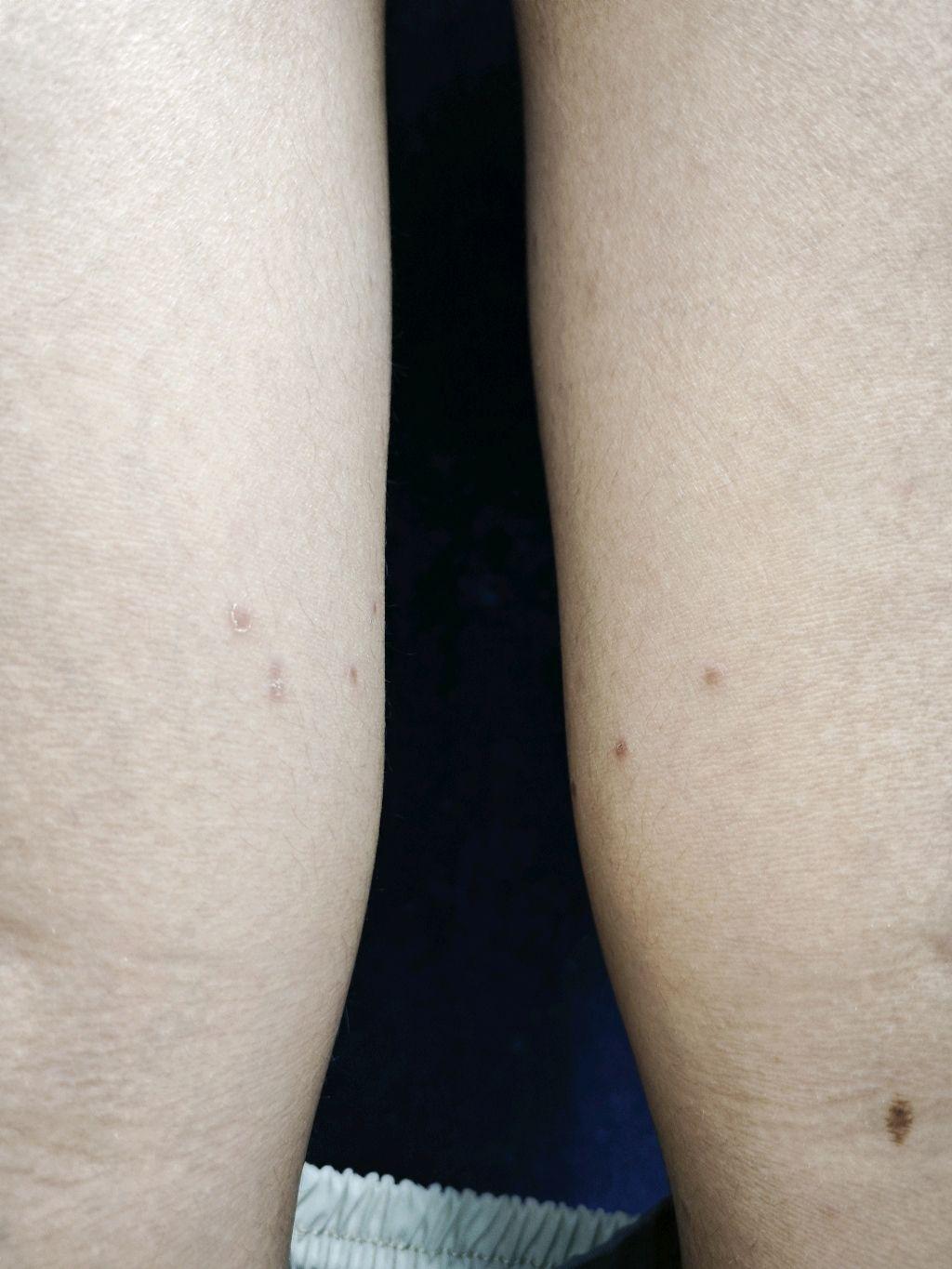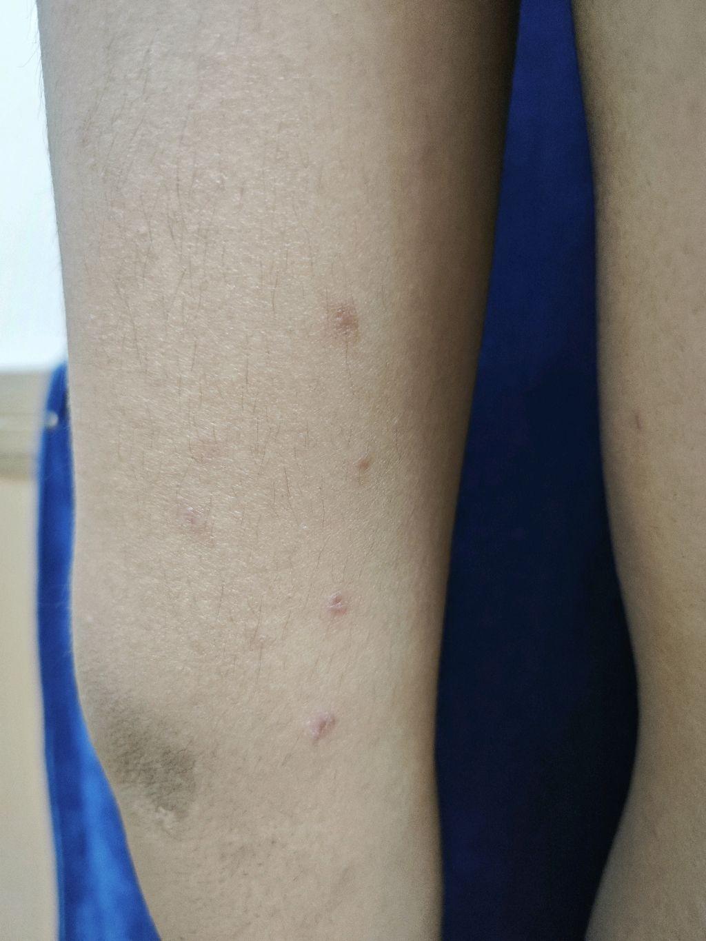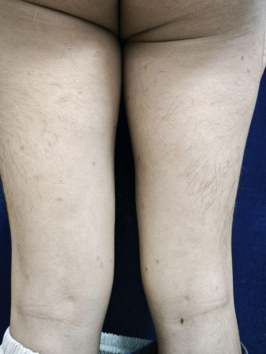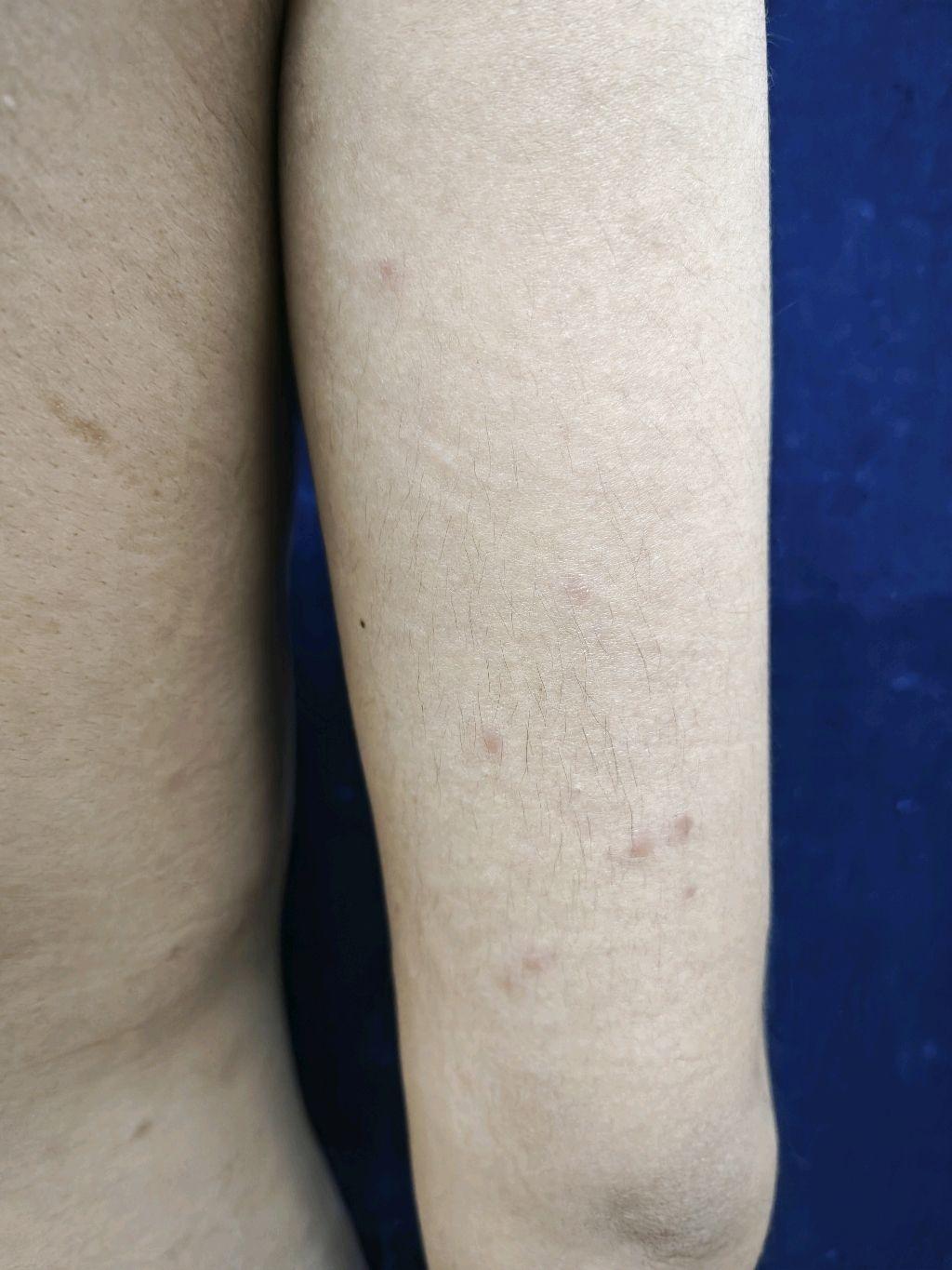 患者青年男性,全身红斑1月余就诊,无明显瘙痒,无其他不是,有高危性行为史。查体:躯干、四肢大量散在的淡红色斑疹,部分表面见鳞屑。手掌及足底见鲜红色斑疹,皮疹较躯干更红更大,表面形成鳞屑附着,边界清除。辅查梅毒螺旋体抗体阳性,梅毒滴度1:128。确诊二期梅毒。