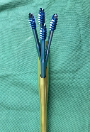 3DPFN特点一、4枚空心螺钉作为头颈螺钉,应力分散为四份,每一枚空心钉头端压力减小,不容易切割股骨头二、4枚空心螺钉,构成三维立体结构,而不是单一平面,抗旋转能力更强三、4枚空心钉分布于股骨头上下前后4个象限,对于一些病理或者医源性因素导致的骨头、股骨颈内的骨缺损,也能应对。因此可以用于翻修。四、4枚空心螺钉,去中心化,更贴近皮质骨,对骨质把持力更好五、空心钉产生的拉力作用,强于螺旋刀片。六、相比较于目前的其他的髓内固定系统,髓内钉近端的滑动孔直径减小,孔壁厚度增加,机械强度增加,使髓内钉近端的折断几率减少七、髓内钉为空心钉提供支撑,缩短空心钉力臂,可减少股骨颈骨折患者卧床时间八、髓内钉可以连接瞄准器,打入空心钉更高效精准