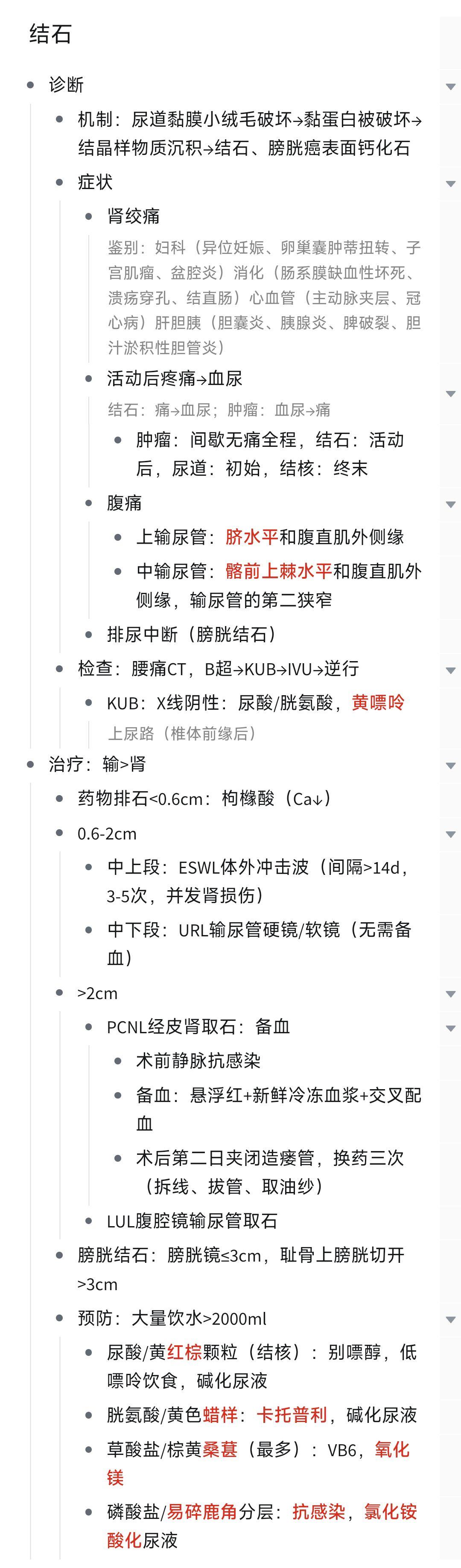 在结石亚专科轮转了两个月,分享一下执医备考的记录归纳总结,也是备考规培结业。其中有一部分内容是我们医院临床诊疗,和其他医院有些许区别,恳请指正。其实和理论学的不太一样,理论上典型临床症状活动后疼痛继发血尿,然后首选B超后还会做kub。实际上在急诊门诊或泌尿普通门诊见到一般都是腹痛过来的,症状不典型,然后体检双肾叩击痛,一般是单侧输尿管结石。我们这一般是直接上腹盆CT,毕竟也不知道B超医生会不会突然给个假阴性。然后根据CT初步测量结石直径,直径不大能药物治疗就尽量不要考虑碎石,而且相比于溶石药物更重要是镇痛和解痉药物。可能是因为医疗知识普及,临床上遇到很多结石病人很喜欢要求做碎石,觉得ESWL后就直接治愈了,做了ESWL后排小结石就会有不满,觉得是医生技术问题。个人感觉还是以药物治疗为主最好,医嘱日饮水2500ml。入院做PCNL的,七八月是我们这PCNL高峰期,九月都是来膀胱镜取支架的。