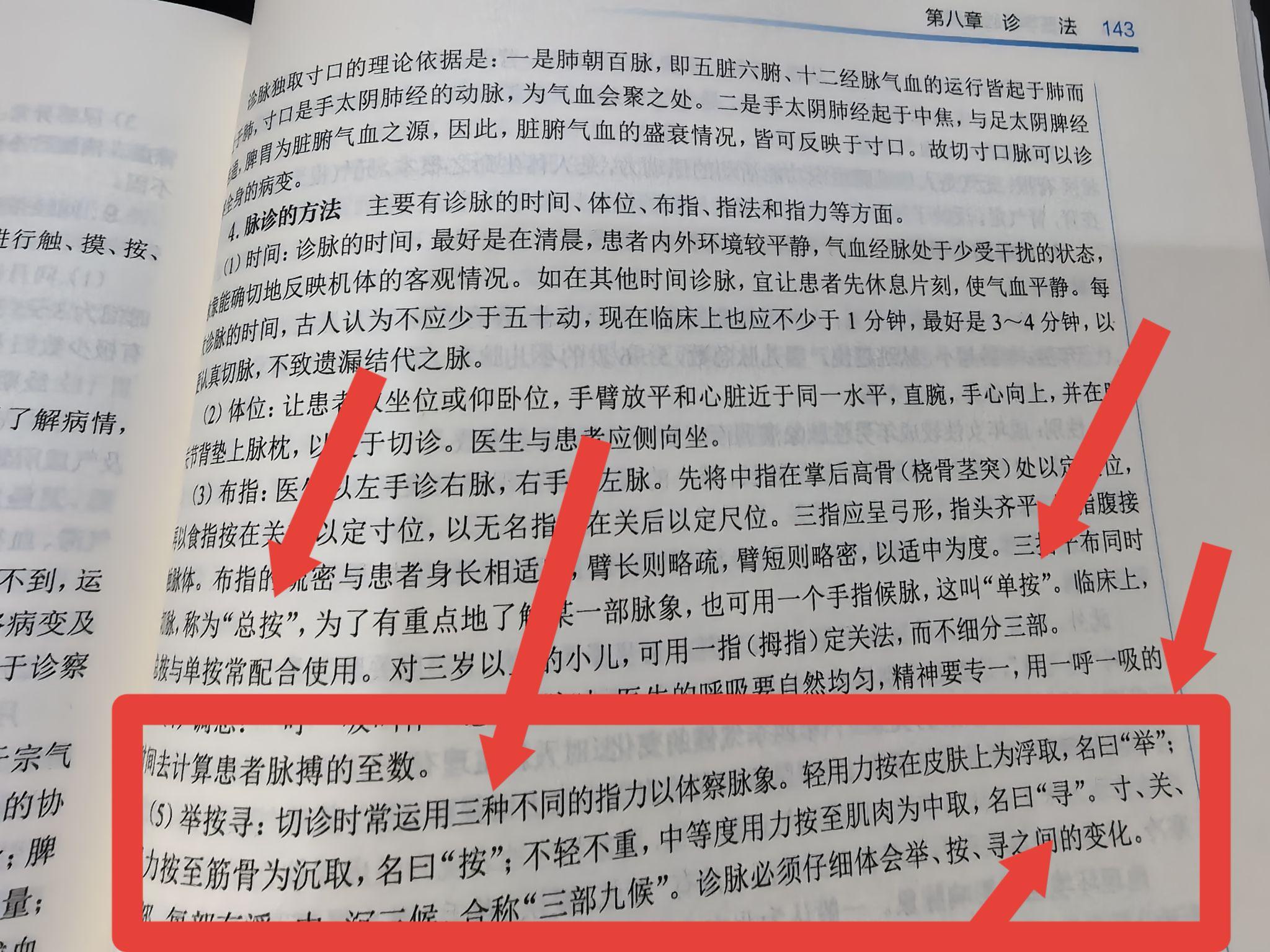 引:“守正”方能“出新”。彻夜难眠必须记录!讨论:不管是百度还是DeepSeek乃至其他搜索引擎结果肯定都会支持这个教材的解释,但是不得不指出来的是所有的答案都基于大数据算力分析的结果而得出来,个人认为“举、按、寻”正确的运指力度依次应该是“轻、中、重”而并非像教材描述是“轻、重、中”。?结果:对于“按”的对象我们是能感知能看见,而“寻”的对象是未知是我们要努力去寻找答案,所以在这里寻的运指力度是不是应该更重?结合疑难杂症或危重病人的脉象特征我们是不是更应该“寻”?所以古籍的描述既然是“举、按、寻”为什么我们要打破常规的将“轻、中、重”这一传统顺序和演变规律理解成“轻、重、中”?传承过程中到底是对古人智慧的误解还是所谓的“创新”?ps:有质疑绝对没有哗众取宠,只是个人不同见解,改革本来就允许试错,不然我们怎么会不断的将教材从第一版修订到“N”版?在使用教材的过程中也曾发现过人卫出版社其他教材出现过内容重复的瑕疵,自己也经历过教材的编写工作,不是说教材不好,而是越来越清晰的意识到教材科学严谨的重要性,所以我只能将个人意见分享给我的学生听!希望他们能在传承的道路上守正不守旧,创新不从众,要有思辨性和独立思考能力。
