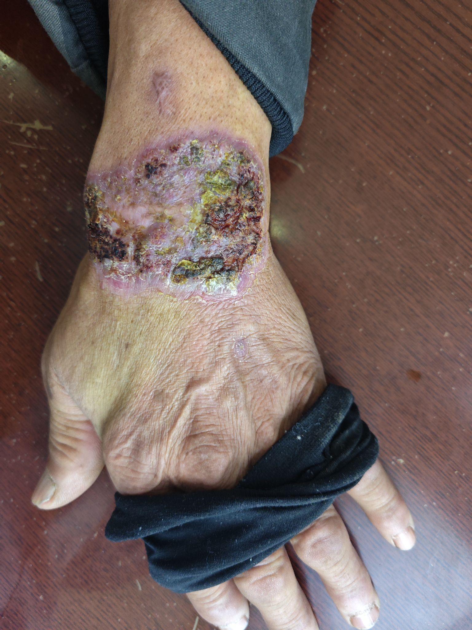 查体:左手腕部可见约8x10厘米大小浸润红斑块,表面瘢痕,结痂,少许渗出。