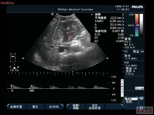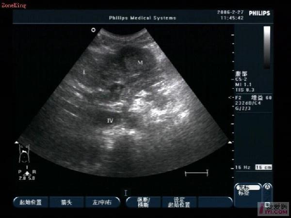 肝左叶探及约42mm×35mm中等偏低回声,牵拉包膜,引起腹痛,回声不均质,并且RI:0.88,PSV:32.4cm/s;占位改变最大,门静脉内径13 mm,不算很宽,正常可以考虑1.4CM,作为参考值,内部回声不是很清楚。符合肝实质内占位性超声改变