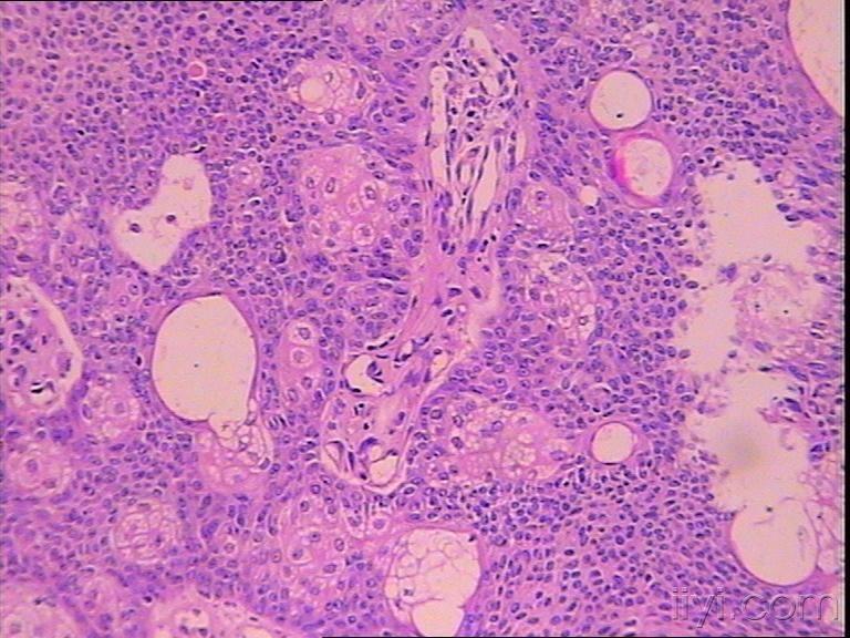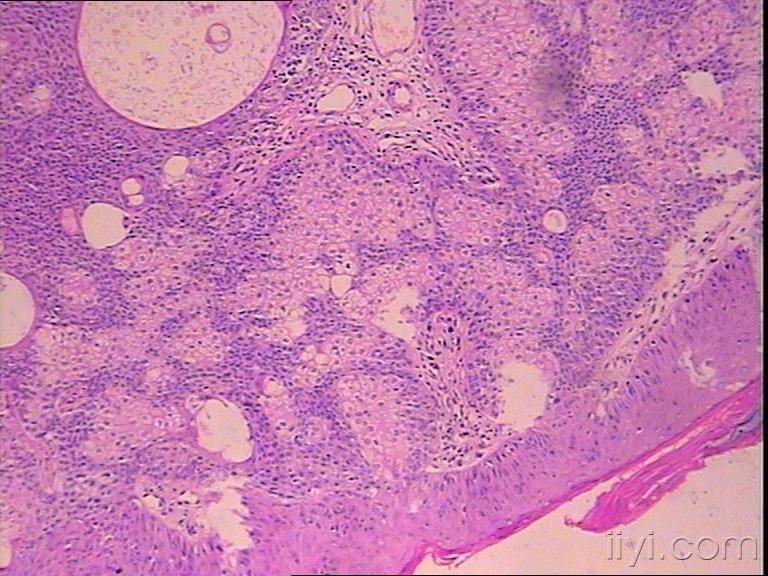 明显看到皮脂腺细胞,应该是皮脂腺病变中的一个,有皮脂腺分化的有皮脂腺上皮瘤,皮脂腺瘤,皮脂腺腺瘤,皮脂腺增生,皮脂腺痣,基底细胞癌癌伴皮脂腺分化。基底细胞多于50%可以诊断皮脂腺上皮瘤,不然诊断皮脂腺腺瘤,本例诊断皮脂腺腺瘤似乎合适些。