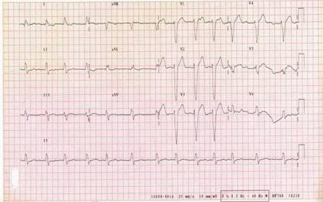 心电图心律示78次/分。心律不规整,正常P波消失。这些特点符合房颤。QRS波群〉120ms,右胸V1导呈rS型,左胸V6导呈〉120ms 的R型。这些都是LBBB的特点。